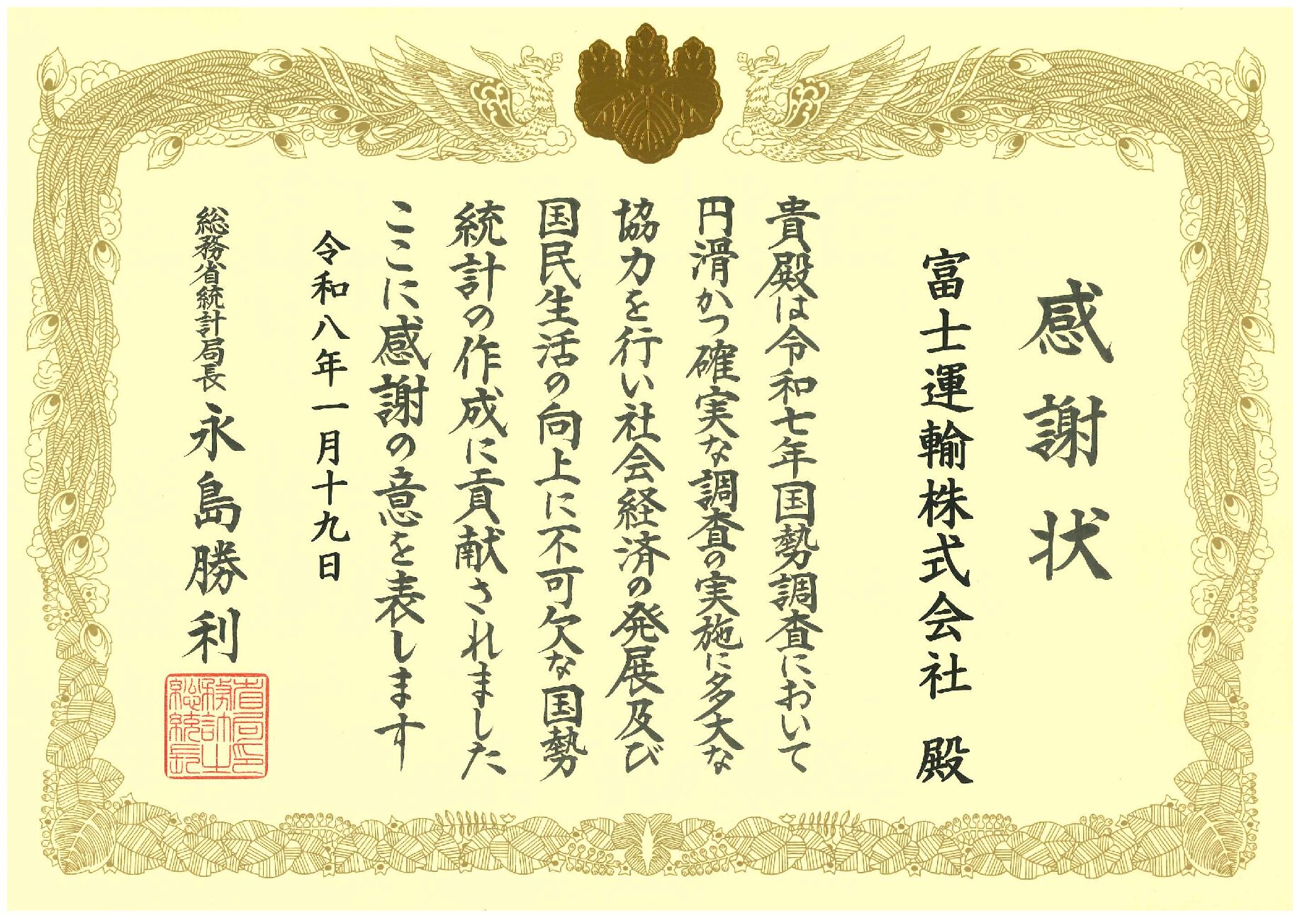 「令和7年国勢調査」において、当社が所有する共同住宅等の物件に関する調査や、広報・周知に協力した企業として、この度、総務省統計局長より感謝状を頂きました。